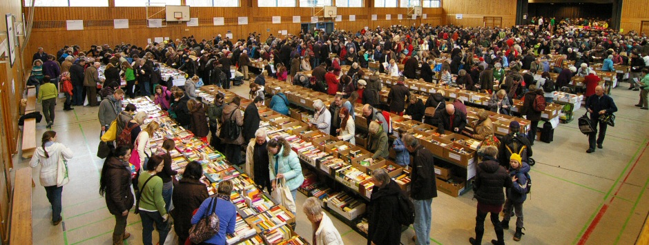 Abermals treffen sie sich am 21.02. und 22.02.2015 in der Wildmooshalle in Gröbenzell. Mehr als 1400 Bananenkisten wurden für den Flohmarkt gespendet und von vielen fleißigen Helfern nach Kategorien sortiert. Geht man davon aus, dass in eine Bananenkiste über 100 Taschenbücher oder mindestens 50 Hardcover-Bücher passen, kann man sich ausrechnen, welcher Berg an Literatur dort auf dem Bücherflohmarkt angeboten wird.