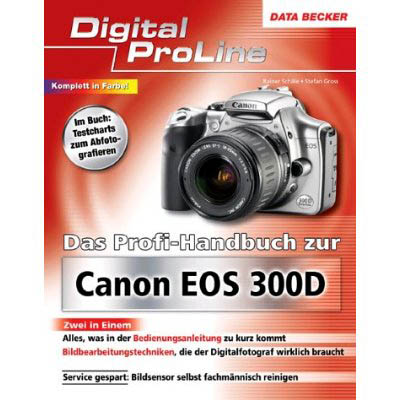 Geeignet für alle, die das Maximum aus ihren Canon Digitalkameras herausholen wollen. Es erschien 2004 im Data Becker Verlag unter der ISBN: 3815826004 bzw. 978-3815826003. Das Profihandbuch zu den folgenden Modellen der Canon EOS 350D und EOS 400D veröffentlichte der gleiche Verlag 2005 und 2006 unter den ISBN: 3815826098 bzw. 978-3815826096 und 381582625X bzw. 978-3815826256.