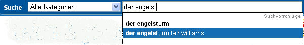 Man gibt, nachdem die Amazon Seite geöffnet wurde im oberen Teil einfach den Titel und den Autor des Buches ein und bekommt meistens schon nach ein paar eingegebenen Buchstaben einige Suchvorschläge angezeigt und braucht das Buch nur auszuwählen.