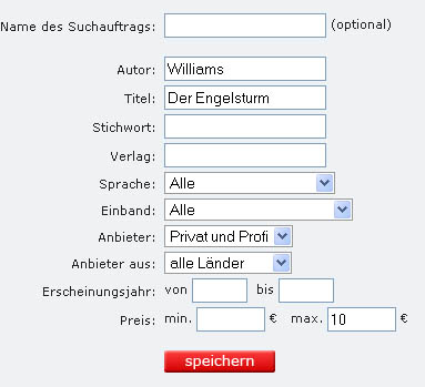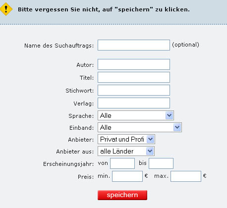 Die folgende Eingabemaske erklärt sich eigentlich von selbst. Auch hier reicht die Eingabe des Autors, des Titels und des max. Preises, äquivalent zu den Eingabehinweisen auf Booklooker. Eine Bezeichnung ihres Suchauftrages, der z.B. aus dem Titel des Buches bestehen kann, ist unumgänglich, da der Suchauftrag sonst nicht abgespeichert wird. Es dient außerdem zur besseren Übersicht in ihren angelegten Suchaufträgen.