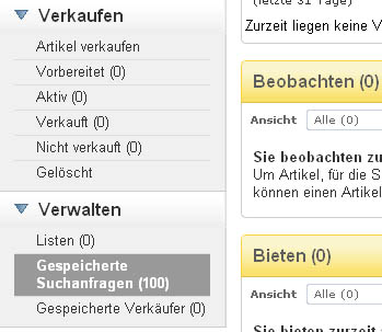 Hier geht es vorrangig um das Einrichten eines Suchauftrages. Wir haben uns also bei ebay registriert und eingeloggt. Unter der Mein ebay Übersicht sehen wir in der linken Navigationsleiste einen Reiter mit dem Namen Gespeicherte Suchaufträge verwalten. Wenn sie erstmalig einen Suchauftrag einrichten wollen, sollte dort die Zahl 0 stehen. Bei ebay ist es möglich, derzeit max. 100 Suchanfragen zu erstellen.