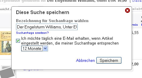 Obwohl Eurobuch auch den Bestand von Amazon, Booklooker und ebay durchsucht, ist es ratsam, sich für die jeweiligen Plattformen eigene Suchaufträge bzw. Lesezeichen einzurichten, da die einzelnen Datenbanken nicht zu gleichen Zeiten aktualisiert und die Suchauftrags-Mails verschickt werden.
