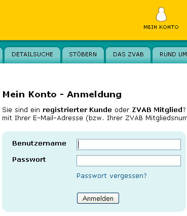 Also, die Vorgehensweise bei dem ZVAB ist ähnlich der bei Booklooker. Nachdem wir uns registriert haben, kommen wir durch einen Klick auf Mein Konto zu folgendem Bild und können uns mit unseren Daten anmelden.