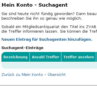 Fertig. Nun heißt es abwarten und Tee trinken. Der Suchauftrag wird vom ZVAB bearbeitet und den angeschlossenen Antiquariaten angezeigt. Diese melden sich direkt bei ihnen und unterbreiten ihnen die Angebote.