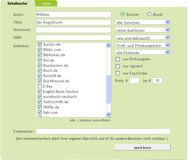 - Max. Preis (der Preis, den ich für das Buch max. ausgeben möchte)