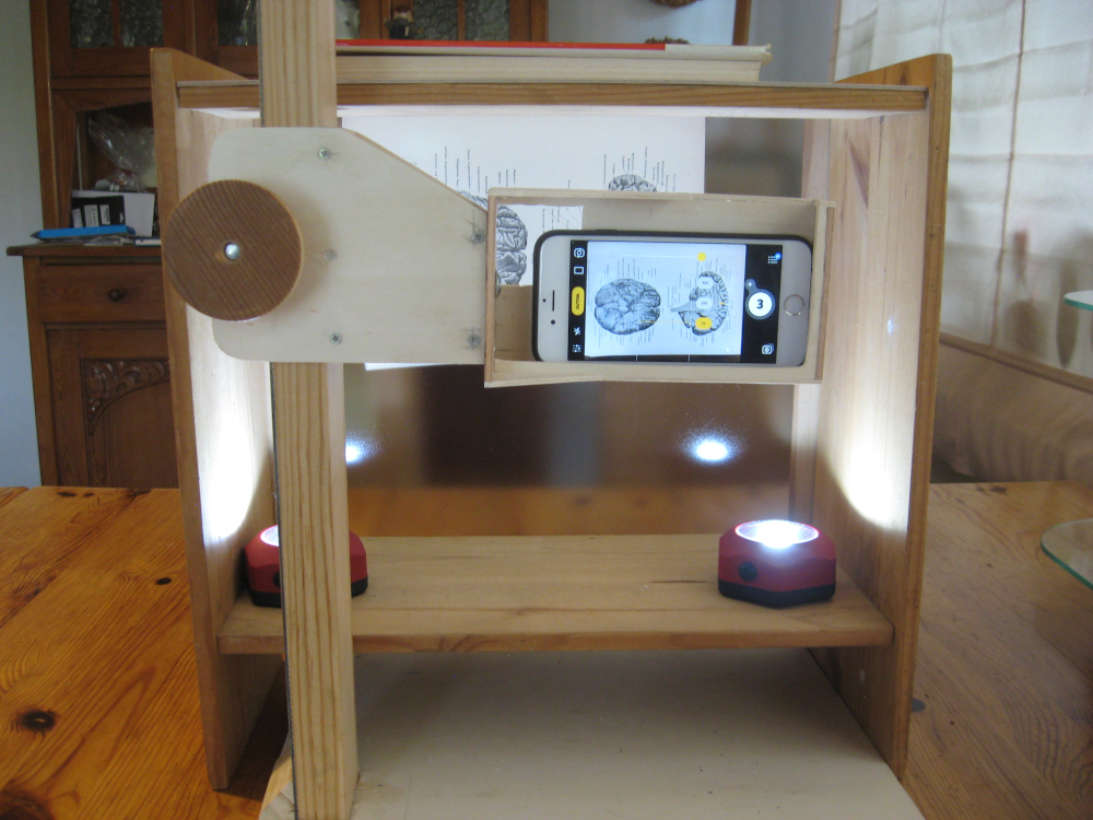 Ist die Handywanne meines Dokumentenscanner in der Horizontalen ausgerichtet, kann ein Foto geschossen werden. Da sich die Handywanne hoch- und herunterfahren lässt, das Regal mitsamt des aufgelegten Buches seitlich verschieben lässt, kann die Kamera auf die aufzunehmende Seite ohne großen Aufwand mittig positioniert werden. Ich füge noch Fotos der Anordnung bei.