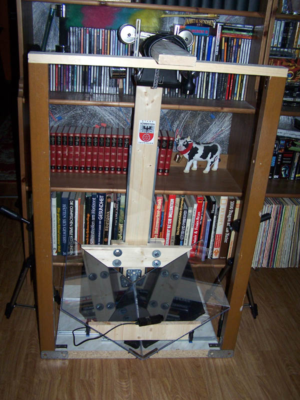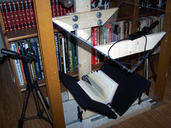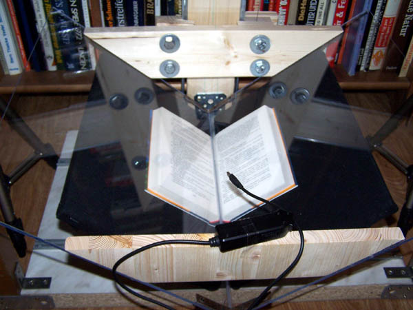 Buchscanner-Projekte sind Unikate, die sich in ihrer Form, dem Aufbau und der Wirkungsweise auch grundsätzlich unterscheiden können. Herr Fischer überließ mir freundlicherweise einige Bilder seiner Konstruktion, die ich hier gerne einfüge.