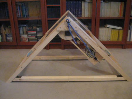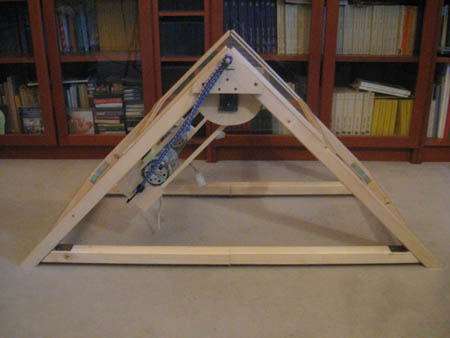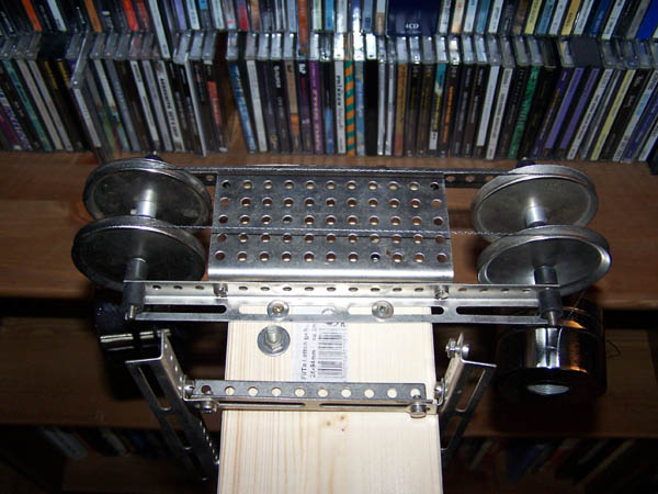 Diese eigenartige aber wohl einmalige Konstruktion ist zu empfehlen, falls ihr Buchscanner zu den etwas größeren Exemplaren gehören soll. Da mein Buchscanner problemlos Bücher von einer maximalen Größe bis 405 mm Länge und 345 mm Breite scannen kann, ist der, ich nenne ihn einfach mal Schlitten, auf Grund seiner Größe doch ziemlich schwer geworden. Schlitten ist das Teil, dass manuell immer hoch und runter gefahren wird, um die Seiten des Buches umzublättern. Daher habe ich den Buchscanner um ein Gewichtsausgleichkonstrukt (was für ein Wort) ergänzt, dass es nun ermöglicht, den Schlitten mit dem kleinen Finger zu bewegen. Die 2 Gewichte einer Hantel sorgen an einer geflochtenen Angelschnur und über 4 Umlenkrollen geführt, sozusagen für eine leichte Auf- und Abfahrt des Schlittens.