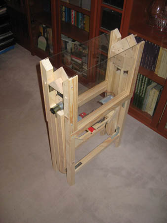 Was habe ich nun für meinen Buchscanner verwendet? Etwas Holz, eine Plexiglasplatte (glasklar), einige Schubladenschienen und einen Halogenstrahler (120 Watt) aus dem Baumarkt mit den 3 Buchstaben. Schrauben und Muttern hatte ich noch reichlich hier rumliegen. Zusätzlich wurden 2 ausziehbare Stative mit 3D Kopf angeschafft, die die beiden teuersten Investitionen des Projektes, 2 Digitalkameras des Typs Canon Powershot A590 IS, sicher fixieren. Bisher sind Kosten von ungefähr 80,- Euro (ohne die Kameras) entstanden.
