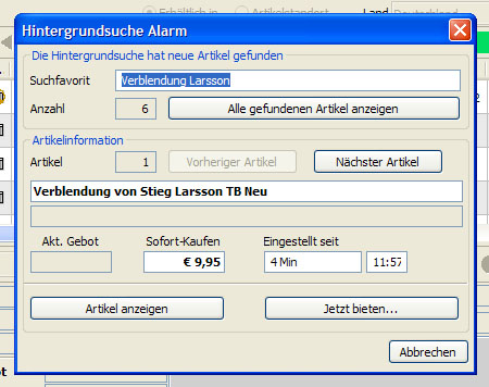 Lassen sie mich an dieser Stelle noch die geniale Hintergrundsuche des Programms anhand eines Beispieles näher erläutern. Wir gehen davon aus, dass Sie auf der Suche nach einem bestimmten Buch sind und den ebay-Markt nun überwachen möchten, bis jemand das gesuchte Buch anbietet. Erstellen Sie einen Suchauftrag mit dem Titel des Buch, eventuell den dazugehörigen Autor und den maximalen Preis, den Sie bereit sind, dafür auszugeben und speichern Sie ihn ab.